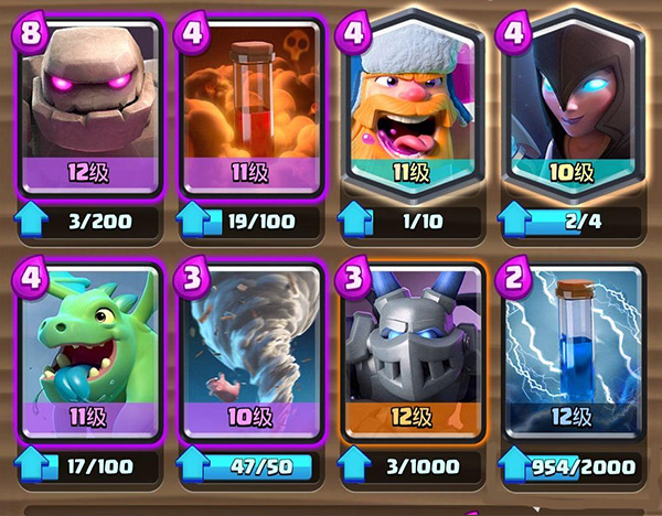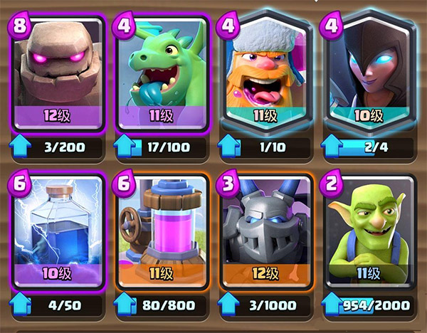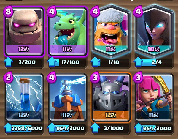 第三种就是带电塔的用这套的时候尽量不要主动出击,利用电塔+重甲亡灵+暗夜女巫构成的三角防御线,来赚取费用差,尽量拖到对己方极为有利的双倍圣水的时间即使双方的防御塔血量差很大也不要灰心,暗夜女巫和樵夫的推进能力,一定会让你大吃一惊的。