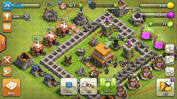 (2)玩家搜索到自己喜欢的对手后,需要在限定的3分钟内,将对手村庄内的主要建筑摧毁掉,当摧毁度达到50%时,即可获得胜利。胜利的玩家从对手的村庄里,掠夺到一些金币、圣水、暗黑重油等奖励。同时,玩家可获得相应的奖杯,奖杯越高胜利获得的奖励越多。如果玩家未能在规定时间内,达到50%摧毁度,则进攻失败,同时会扣除一些奖杯。玩家在联机模式下,将会耗损一些兵种或药水。