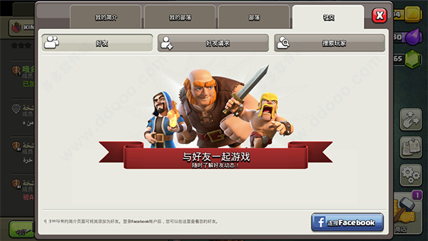 (2)玩家从好友界面里,可查询好友的在线情况、等级信息、村庄布置信息等。玩家还能与好友进行聊天,进行友谊对战。