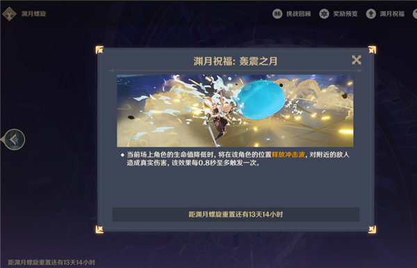 首先来看下本期的深渊buff-场上角色生命值降低时会释放冲击波,完全是为妮露定制的buff,在此buff加持下可以硬抗一些原魔的攻击触发该buff的AOE范围伤害,对于本就群体绽放伤害的队伍再添一笔;