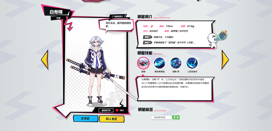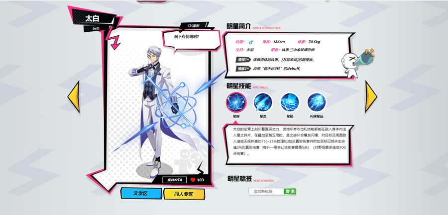 太白:远距离攻击,身份是完美执事:悟静:属于灵能型,带有控制技能,是个萝莉妹抖:红海儿:属于体术英雄,类似于战士。这是三个默认英雄,