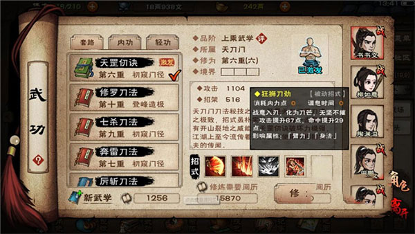 游戏中有丰富的剧情和支线任务,每个选择都会影响结局走向。战斗系统也很有意思,比如奔雷刀诀这种进阶武学需要完成特定任务并准备材料才能解锁。游戏还加入了多种辅助技能,如丹青、书法等,让江湖生活更丰富多彩。