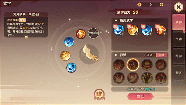 行走江湖,自然要有点门派基本功傍身。“武学”就是每个职业侠士进入游戏后所获得的人物基础技能,升级武学技能可以在战斗中拥有更强大的杀伤力。并且在角色完成转职后,可以学习更高级的技能,正派、邪派各有不同的技能分支可学。随着学会新的转职武功,玩家角色的职业定位也将随之发生变化。侠士们可以自由搭配技能组合,在战斗中也更为简便灵活。