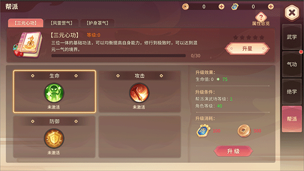 最后,我们来看看“帮派武学”。帮派武学分为三重心法:“三元心功”、“风雷罡气”、“护体罩气”,每个心法都对应着不同的角色属性,侠士们在加入帮派后,可以通过使用帮派贡献和铜钱进行升级,随着心法等级的提升,侠士们的角色属性也会获得相应的加成。
