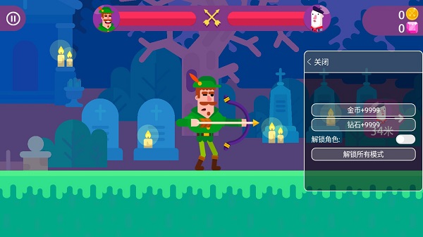 Bowmasters又译为冷血射手,这是一款采用了2.5D画面呈现效果的动作射击类游戏,该游戏风格与《愤怒的小鸟》有些类似,操作方法都是需要玩家以一个合理的角度和力度来掌控你的抛物线弧度,其过程虽然简单,但若想在只有距离显示的数据上成功命中对手还是需要玩家参与大量训练和练习,方能达到一定效果。其次,在冷血射手游戏中还有许多可玩的角色可以使用,但除了造型的不同以外,他们各自拥有的武器和技能也有较大的不同,例如鲨鱼在三叉戟命中对手后还会追加一次冲浪的位移,而卡牌大师的扑克牌可在空中点击炸裂,造成更大范围的伤害,总之类似的技能和选择有着非常多的操控性。针对不少玩家提出的要求,小编在这为你准备了冷血射手无限钻石金币人物全解锁版本供你体验,此版本内置的修改器功能,支持修改无限金币、无限钻石,甚至可解锁所有游戏模式,如果不使用,即为正版哦,如此强大的游戏版本,喜欢的玩家可千万不要错过哦!游戏特色