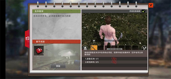 1、首先想要在末日中求生,你必须建造属于自己的家。而基础资源是在末日中生存的必须品,在野外地区收集树木(空手也可以采集资源)