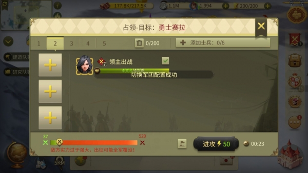 1、在游戏里,对于攻城一直是玩家们所热议的话题,一个玩家的防御强度决定着是否容易被其他玩家所攻陷,而对于进攻的一方,则要注意的的就是攻城应该怎样才能将损失降低至最小,除了需要大量高等级的士兵外,攻城的兵种搭配也可以使得攻城变得简单,所以今天给大家带来的就是攻城兵种搭配详解!快来看看吧!2、 在玩家进行攻城准备时,一共可以搭配5支军团配置,每支军团可以添加6种士兵一共200个士兵位置,除此之外玩家也可以选择领主出战,以及搭配三个侍从出战。