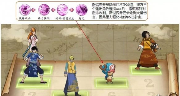 上图中,新世界山智&新世界奈美先出手,对敌方的1号或者4号的前排造成破盾和击杀,再跟上新世界路飞放奥义来收割,以新世界罗宾的加速天赋来确保抢先手,同时新世界罗宾作为“弃子”吸收伤害。