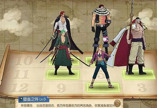 新世界路飞在游戏中的定位就跟他的性格一样,非常直接了当,简单粗暴,就是能抗+能打。在阵容搭配上,新世界路飞虽然拥有超强的坦度,但他的闪避不出众,既没有复活类技能,也没有锁血技能,所以不适合放在前排,其他位置可根据自身需求站位。下面来推荐两种阵容的搭配,也欢迎小伙伴们分享在实战中摸索出来的其他阵容搭配哦~