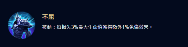 被动:每损失3%最大生命获得额外1%免伤效果。