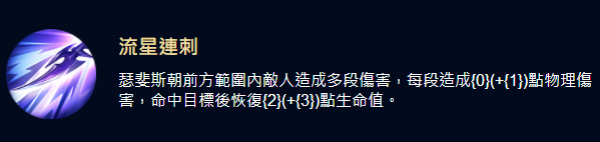 瑟斐斯使出流星连刺,对前方范围内敌人造成高额105(+74)点物理伤害。