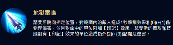 瑟斐斯跃向空中,向地面目标吼出地狱雷鸣,对范围内敌人造成370(+242)点物理伤害并将其短暂击飞。