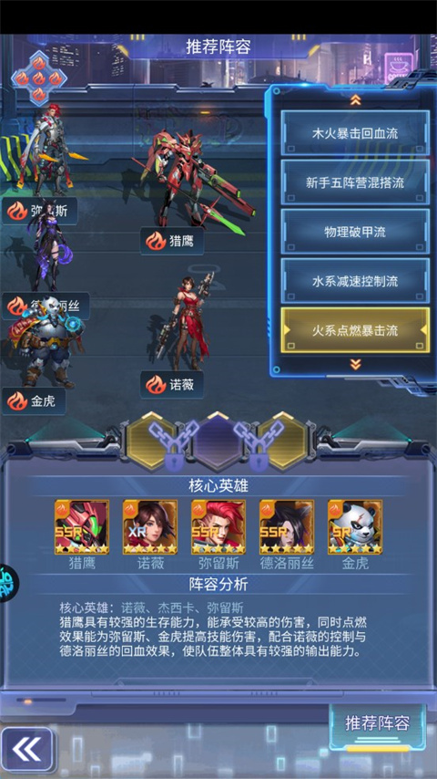 猎鹰具有较强的生存能力,能承受较高的伤害,同时点燃效果能为弥留斯、金虎提高技能伤害,配合诺薇的控制与德洛丽丝的回血效果,使队伍整体具有较强的输出能力。