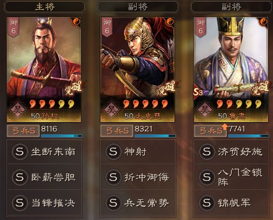 【折冲御侮】+【兵无常势】+鲁肃:最初的想法是,让【兵无常势】保证太史慈在前两回合的血量比孙权高,再利用鲁肃战法【济贫好施】的特性,在第二回合成功把属性给到孙权,让孙权膨胀强大。但似乎达不到理想的效果,大多数情况还是会给到太史,好在差异性不大,双核也不错。
