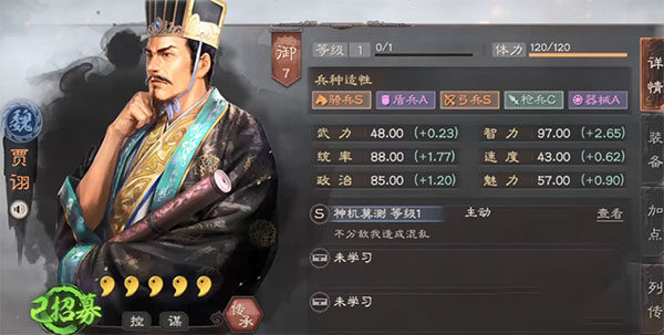 《三国志战略版》共有骑、盾、弓、枪、器械五大兵种,兵种间互相克制。玩家可侦查敌军配置后,应势派遣对应兵种克制敌方大军,实现以少胜多。另一方面,不同武将并非适用所有兵种,有从C到S不同等级的兵种适性,适性越高兵种所能发挥出的威力越大,精兵与良将互相选择,各有优劣,唯有最适合才是最强。