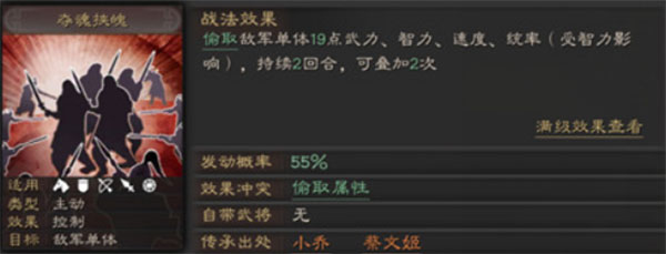 总的来说,该阵容属于双核玩法,其中贾诩这名武将不仅能打出控制效果,而且在搭配上夺魂胁魄之后的输出能力也相当可观,经常性可以凭一己之力打出一万多点的伤害值。而张角在该队中只要基本战法能发触发出两次就可以打出3万多甚至是更高的伤害,所以此阵容最不缺的就是伤害,更别提贾诩还能带来一定的恢复效果。由于有着法正的存在,因此该队有着很高的发挥上限,唯一的缺点就是比较需要弓兵。
