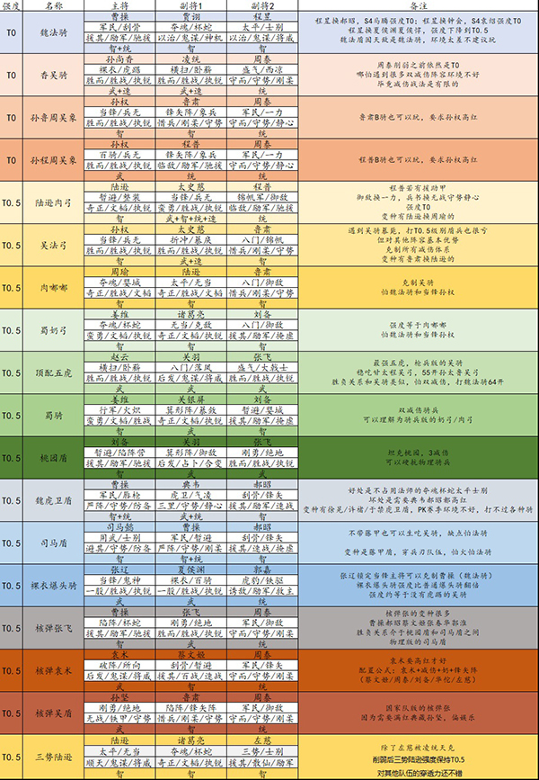2)T0和T0.5代表了两个档次,因为很多队伍玩到最后都会发现,要么打不过魏法骑,要么打不过当锋孙权,所以T0还是魏法骑,吴象。多穿能力最强的吴骑也依然是天花板阵容。