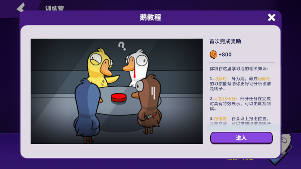 1、基础规则:平民为鹅,杀手为鸭子,在大家都自由活动的时候,鸭子可以猎杀鹅,而且猎杀是有CD的。被鸭子杀死的鹅会在地图上留下鹅腿作为尸体。