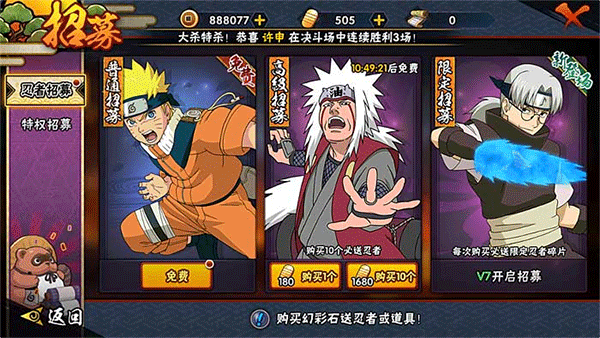 忍者招募:在这个看脸的世界里面,所有的不得意都可以怪脸不好,在《火影忍者》手游里面,最看脸的玩法就是忍者招募(抽抽抽)!忍者招募的玩法是通过消耗【羁绊之卷】随机抽奖,玩家会有一定的几率抽到忍者碎片。高级招募和普通招募基本上是一样的,但由于需要消耗金币抽奖,所以每抽十次一定会送一个忍者,金币充裕的玩家们可以试一试。至于限定招募和特权招募就是土豪玩家的玩法了。