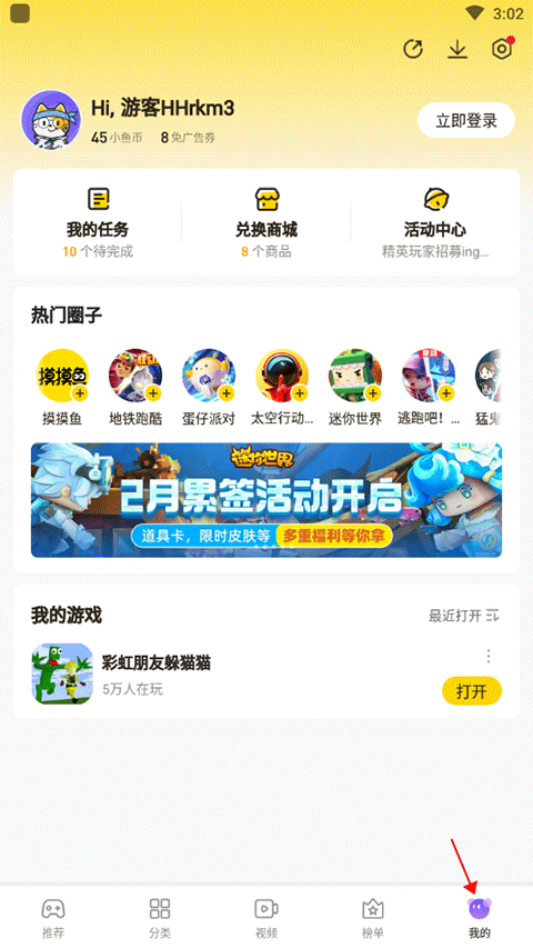 1、启动摸摸鱼APP的图标,进入我的,选择其中的热门圈子进入
