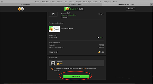 7、进去Razer Gold网站以后,余额不够需要点击那个Reload now,就是立即充值的意思