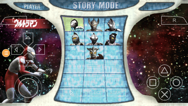 1、下载好奥特曼格斗进化0中文版手机版游戏后点击进入,可以看到首页,在左边的上下箭头选择模式,选好后在右边圆圈确定