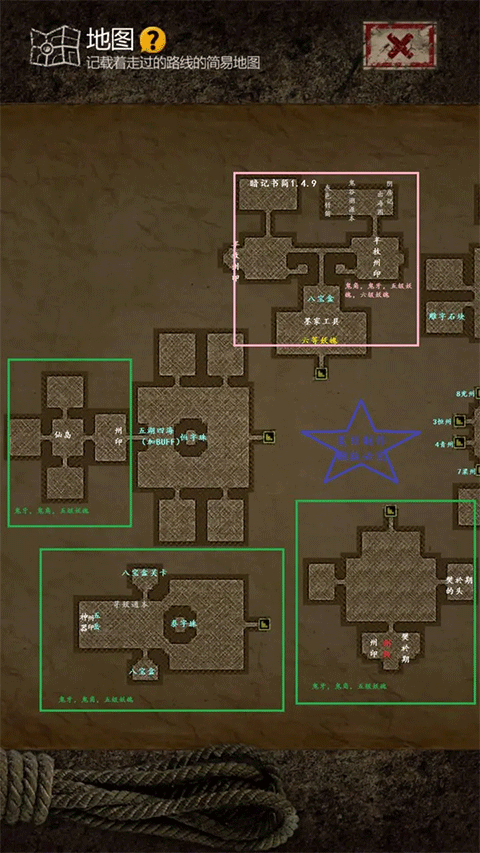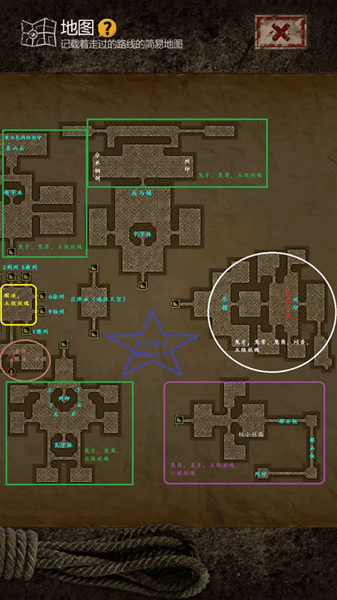 全图只要按照房间顺序走就不会卡关,我已经标记了房间序号,其中只有雕字石块和华字珠是要先去下一个房间拿到后再回头开。【每个州的房间里一定有州印,州印的位置都在图中标识清楚了,大家可以看到】PS:推荐在主厅刷够材料升几个三星人物,在此之前看到盾兵就跑,打不过,别硬刚。