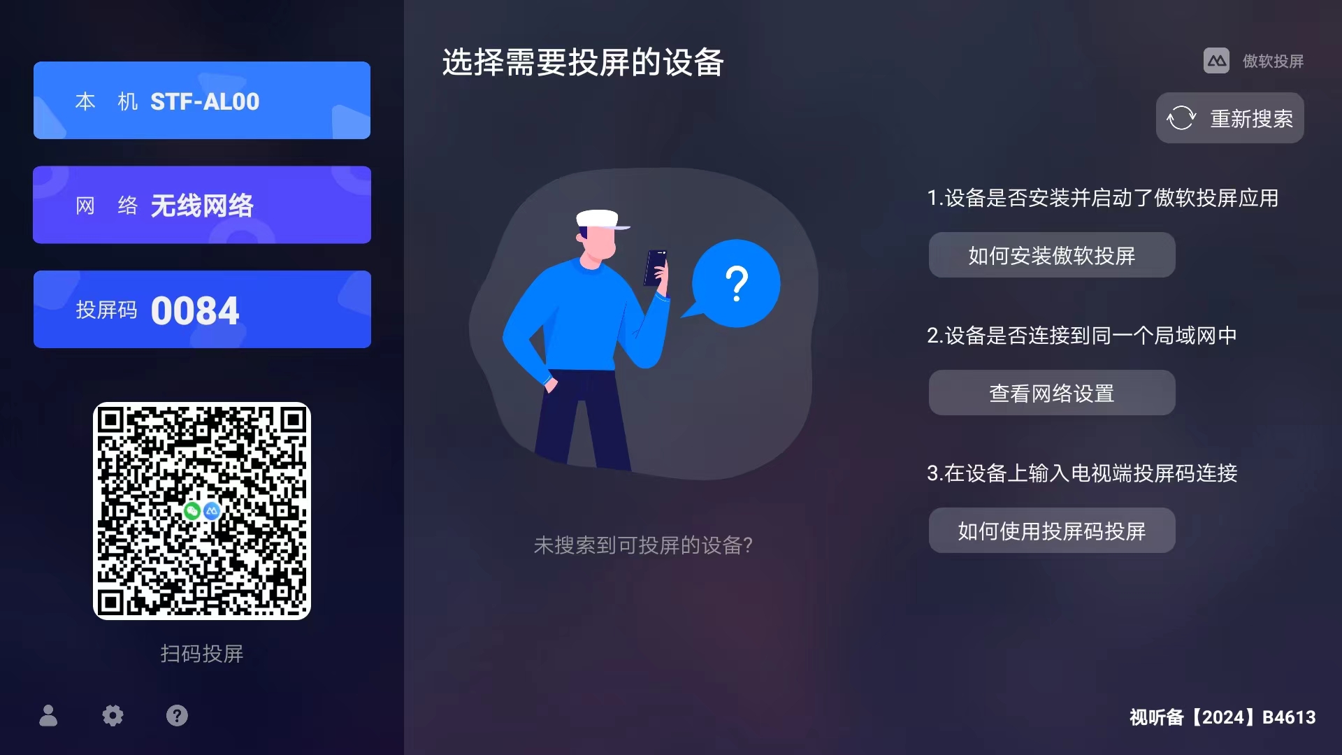1、打开电视端傲软投屏,找到在电视上显示的投屏二维码。