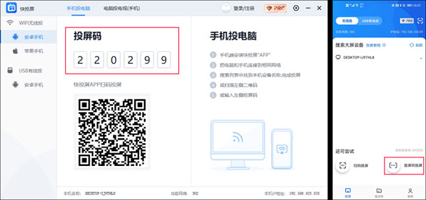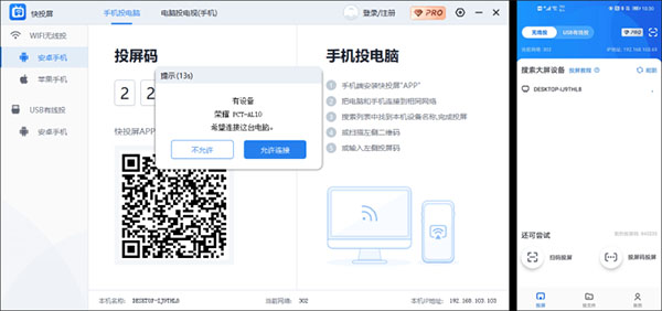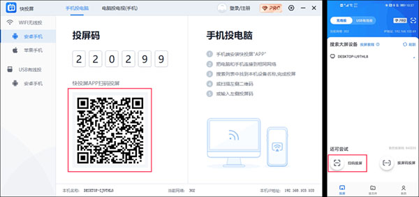 1、安卓手机和电脑同时打开快投屏(支持WIFI投屏和远程云投屏)。