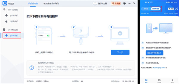 注:为实现安卓手机有线投屏到电脑,需要电脑安装:快投屏PC。共有USB有线投屏一种方案。2.1USB有线投屏
