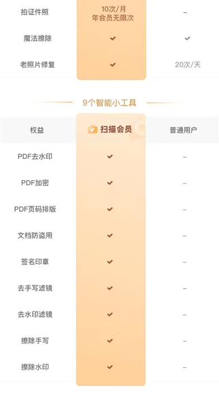 会员权益有超清拍摄、提取表格、PDF去水印、导出word和导出PDF等等权益。