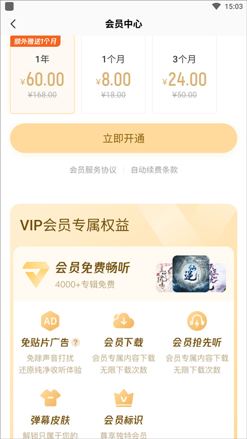 提供应用内会员购买服务,有3种方式可供选择: