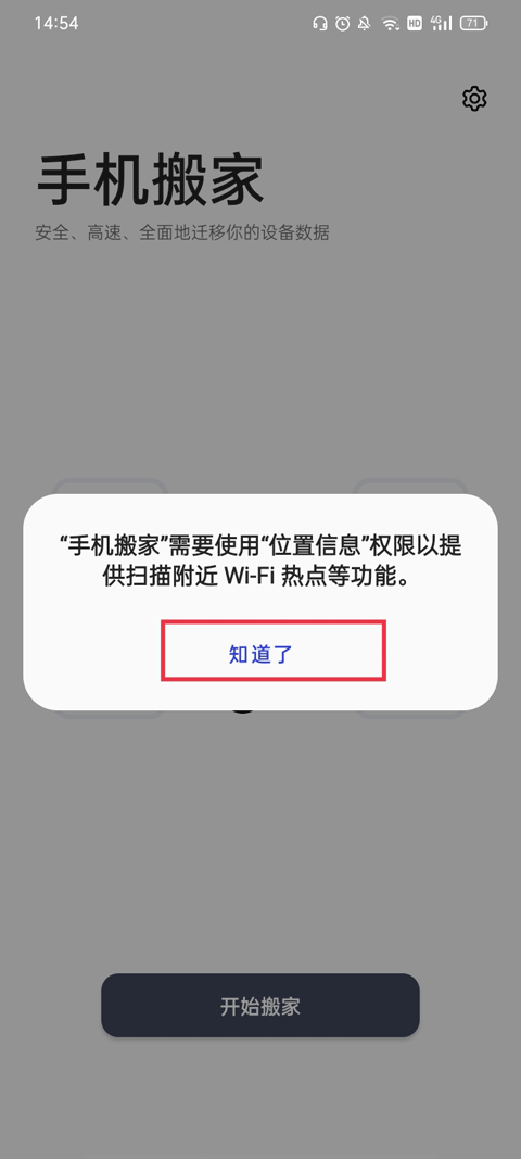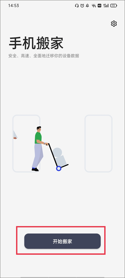 1、打开app进入到主系统页面,点击下方唯一的按钮“开始搬家”。