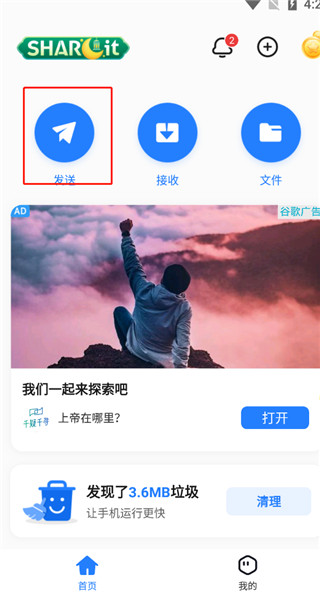 1、打开茄子快传去广告版,进入首页,发送照片的一方可以点击我要发送;