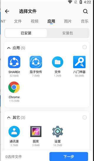 4、器,超豪华核武器,视频、音频、图片、文件夹、甚至连安装包都没有的应用,都轻松传给好友,拥有一网打尽的器度!