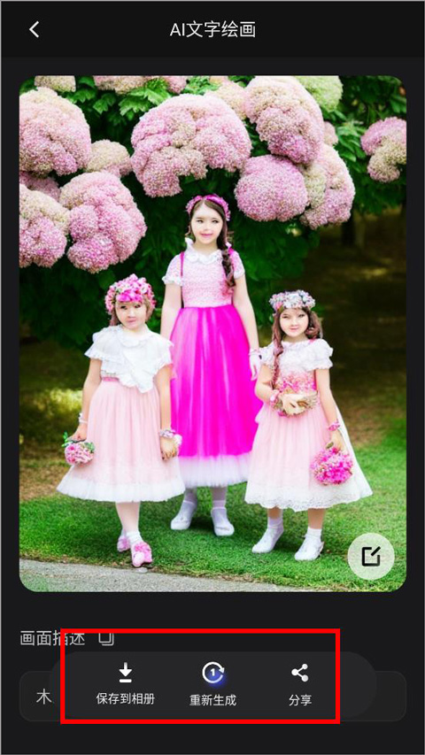 3、进入图片生成页面,用户可查看生成后的图片,右下角编辑按钮可对图片进行简单涂抹编辑,用户还可重新生成图片、保存到相册并分享给好友;