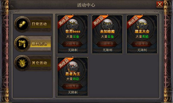 副本活动:副本设计非常明确,需要什么就可以去哪个副本里打,日常需求、材料、装备均有产出,而且挑战起来没有什么难度,玩家可以轻松搞定。BOSS系统中的BOSS们大家都很熟悉,奖励也很丰厚,不过对级数有要求,符合等级前置条件才能进入挑战;如果这些满足不了你的挑战欲望,野外还会定时刷新一批,想怎么打就怎么打。