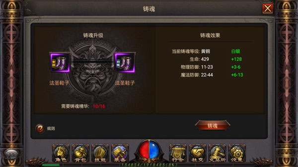 同时铸魂属性提升,根据基础属性提升,但是每个铸魂等级对应装备的属性加成比例都一样。