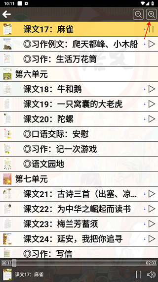 3、点击左上角的目录,可以选择四年级上册的各类课文