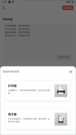 【打印版字帖】支持A4纸导出,可用手机连接打印机或将字帖发送到电脑打印。