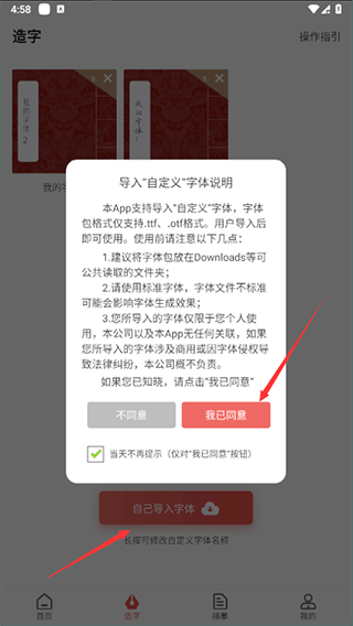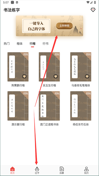 1、打开书法练字帖软件,进入首页后点击横幅或者“造字”进入字体页;