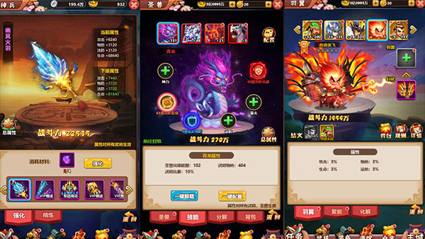 2、 武将可以通过升级、升星、培养、突破、穿戴装备等方式提高属性,经验和大部分养成材料在游戏放置过程中就会掉落,避免了游戏过程中的繁琐操作和过多的精力耗费。