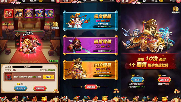1、 主要的武将获取方式就是招募,通过游戏界面下方的酒馆即可进入招募界面,目前游戏内有三种招募方式,均有概率招募到紫色、橙色、红色的武将,除酒馆寻访以外的招募都会提供免费次数,还有十抽保底,让武将的获取更加有保障。