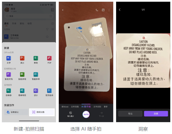 4、AI 随手拍:在首页点击「新建」—「拍照扫描」,选择「AI 随手拍」拍摄照片后,点击下一步和洞察