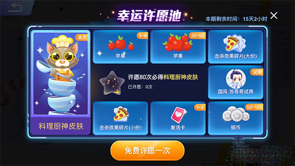 5、幸运许愿池。随意开启一局游戏,死亡之后就可以触发幸运许愿池了,首次许愿是免费的,在许愿池里可以抽取大量的苹果!!