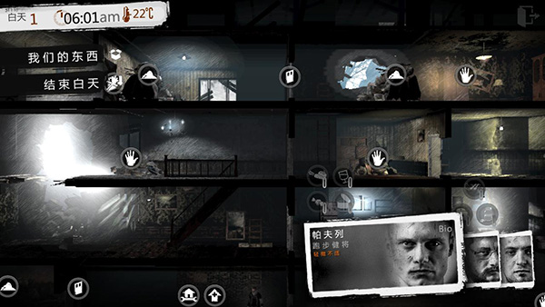 1、搭建避难所:白天大部分地区都处于交战状态,游戏设定白天外出街道上有狙击手(哪管好的坏的=_=,看见会动的就打)所以玩家操纵的角色在白天只能呆在家里活动,这段时间玩家可以操纵角色修复避难所的破洞增强防御,也可以搭建更多的设施,疲劳的角色也可以在这段时间休息。其他幸存者也有几率拜访交易或者寻求帮助,玩家可以与他们交易或者帮助他们(帮助他们有几率让出去帮助的那个角色受伤)。