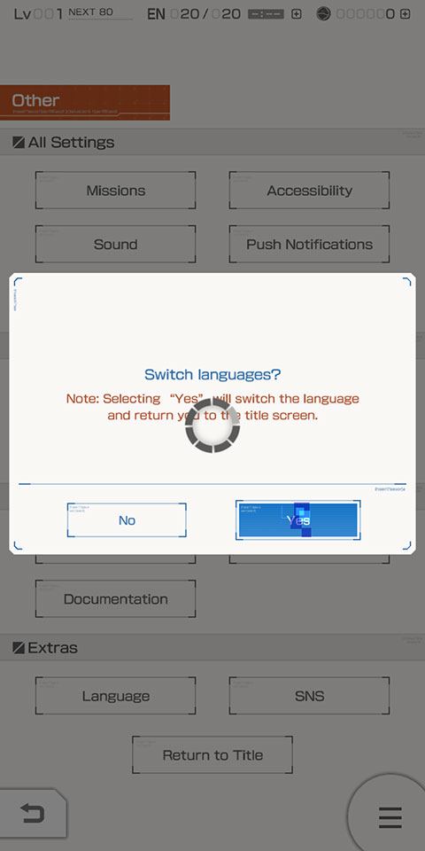 6、系统会提示switch Language是否转换语言的提示,点击【Yes】选项,重启游戏后即可设置为中文语言。