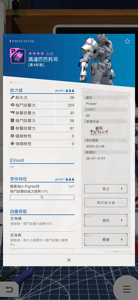 1、打开高达破坏者手游,可看到当前为高达巴巴托司主角机,他的特点是近身战,高火力,格斗加成最高,10%,其余的为5%,