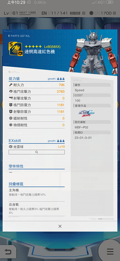 2、这是能天使高达,拥有带威力B+的双军刀技能,他的特点是格斗攻击属性高,