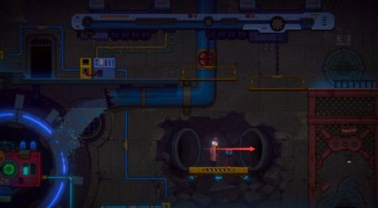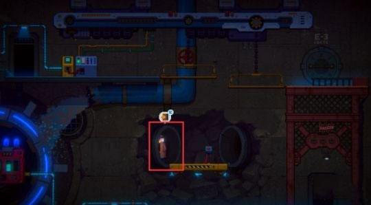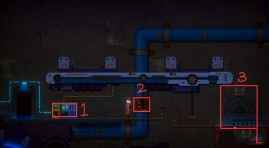 电流接通后,启动下图的控制台【1】,升降台会抬起,把升降台上的红色阀门【2】转动,引出水流。可以顺路进入最右侧【3】的E-3门中获得【遗落的机器人笔记】。